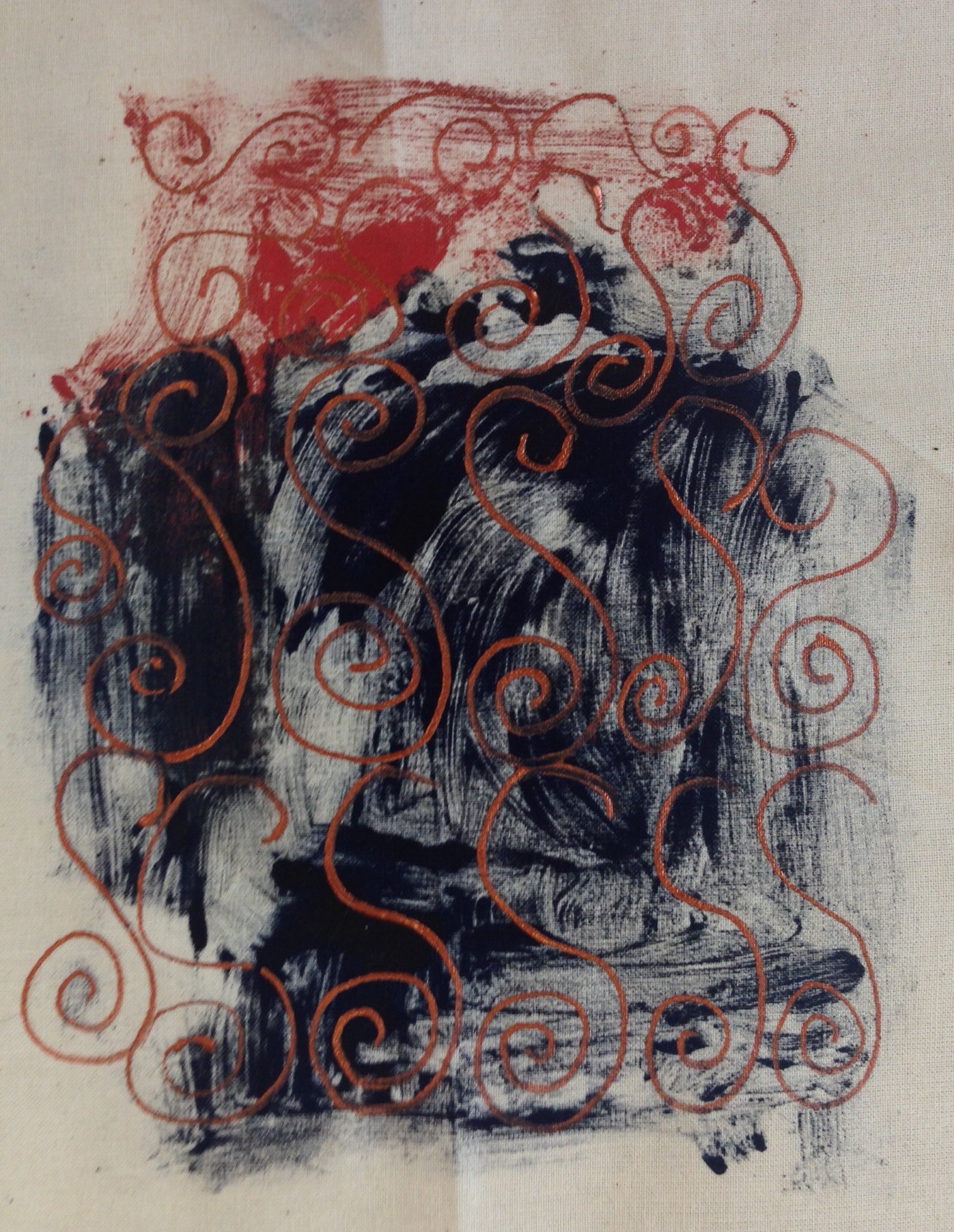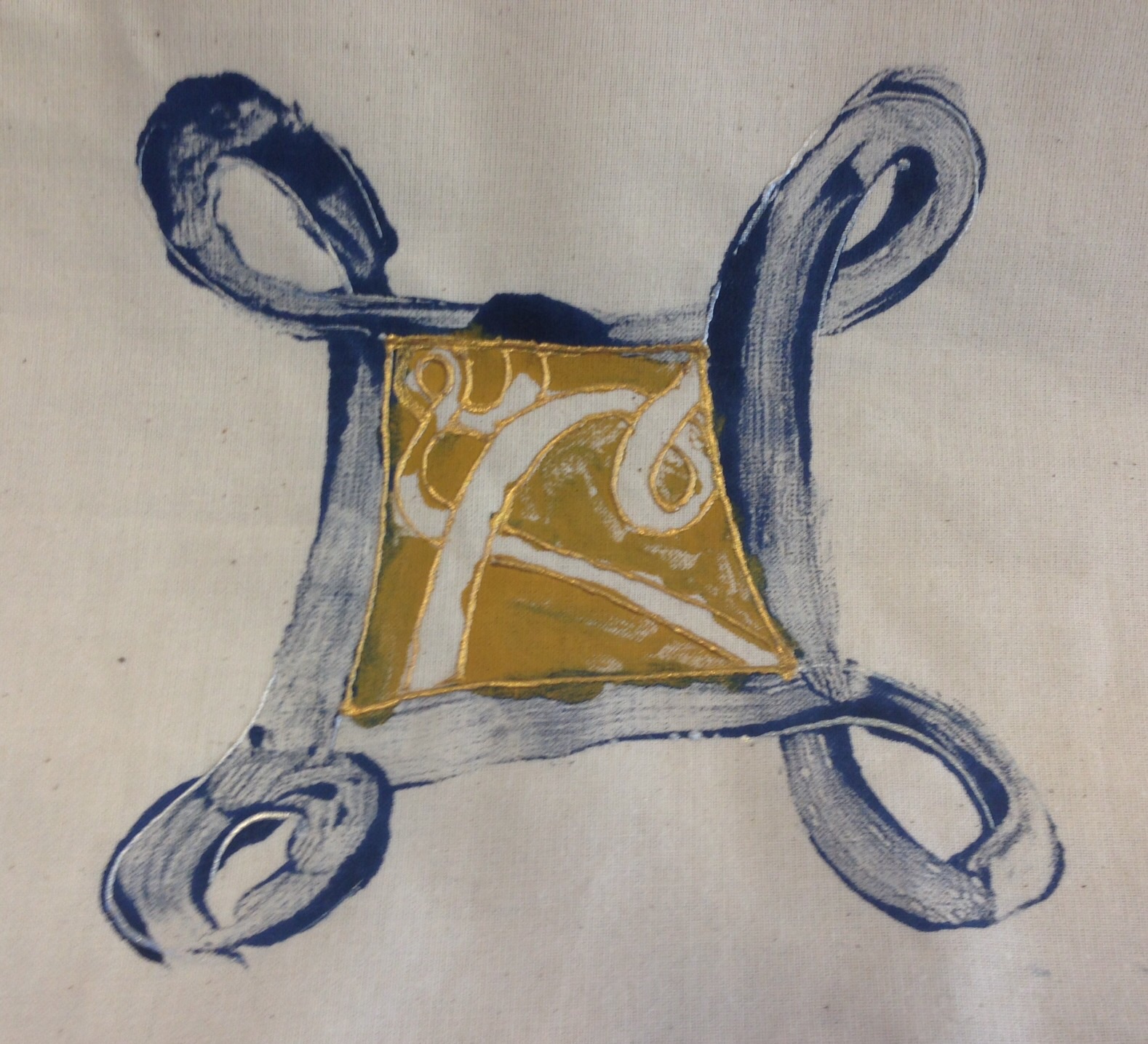 Oliver asked the pupils to work out their own ‘Pictish’ names using old Scottish naming traditions (I was Janice Nic Sam) and to choose a role for themselves in Pictish society. There were many warriors and queens, also jewellers, blacksmiths and musicians. They invented and drew their own personal symbols, inspired by the Pictish patterns we’d been looking at and their own lives and interests. Their designs are beautiful, full of energetic spirals, curves, animals and artefacts. We mono-printed them onto cotton in the classroom and I later embellished the bold prints with details from the original pencil drawings. I used gold, silver and copper ink to bring in some of that Pictish love of ‘bling’ seen in their gorgeous brooches and silver chains.