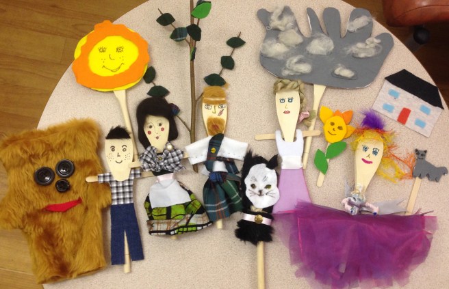 The group were intending to make puppets today and had brought some wooden spoons for the purpose. I had come prepared with some ‘tree stories’ for puppet inspiration but it was soon clear that everyone wanted to get started making – so our cast of characters were suggested by the materials and the group’s imaginations. We all enjoyed the development of each puppet personality, problem-solving together. Double-sided sticky tape turned out to be very useful!