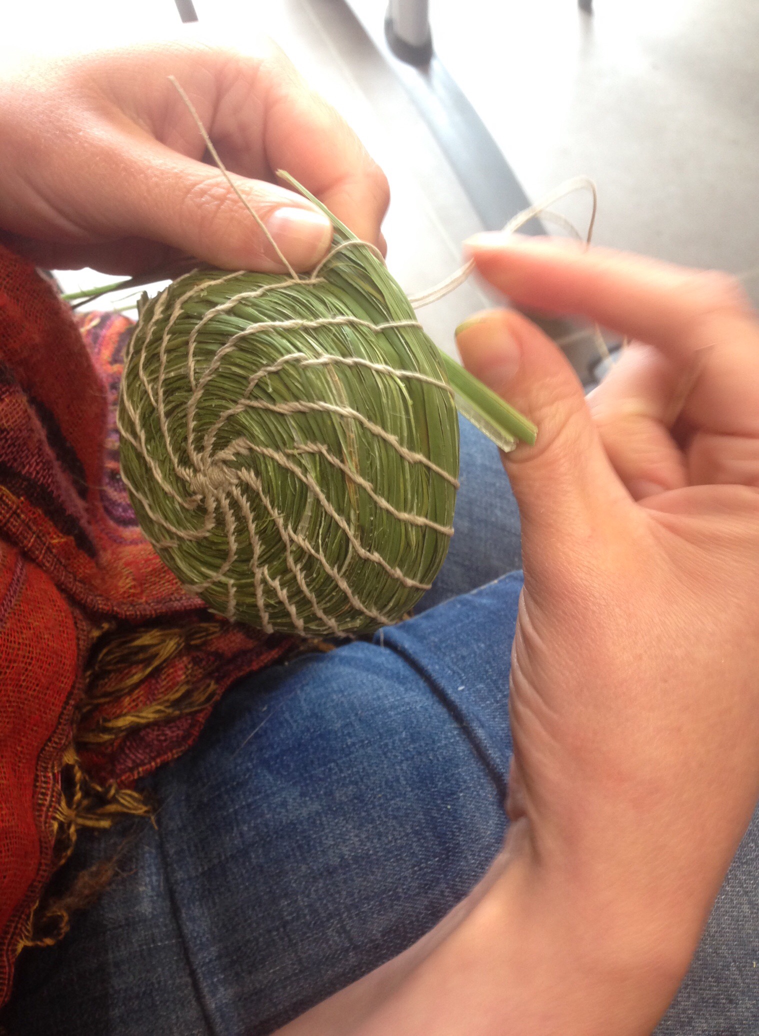 On Sunday, one person found that rolling the reedmace strands while stitching helped keep them together and the stitched coils also looked good. Others in the group tried it out and liked the result. Dialogue in action.