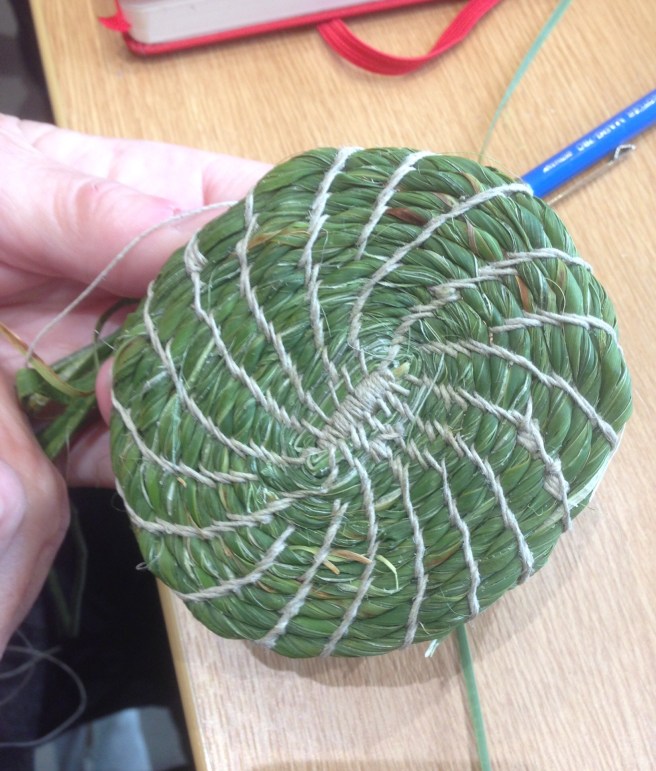 We started by splitting some of the reedmace leaves into strands to let them dry out a little and, after a bit of discussion, we decided to use a ‘fast start’ coiling technique. I’ve been using two starting methods for coiled baskets, the ‘button’ and the one I’m now calling the ‘sausage’! The group spent an hour or so on the first stage of the process, stitching the basket base.