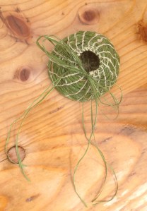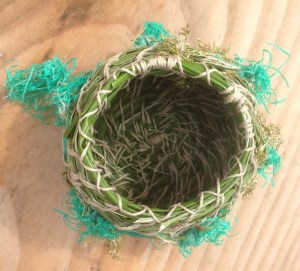 At these workshops everyone decides for themselves what size of basket they want to make. When they feel the base is big enough they can start to build the sides, straight up or in a curve, controlled by placement of the coils of plant material. I encourage people to try introducing other stuff into the structure at this point and let their imaginations take off. I love to see people experimenting with the materials, making decisions about shape and colour, deciding whether to go plain or add decoration. Sometimes the baskets seem to make their own decisions. People say later “It just came out neat” or “It just ended up that shape!”