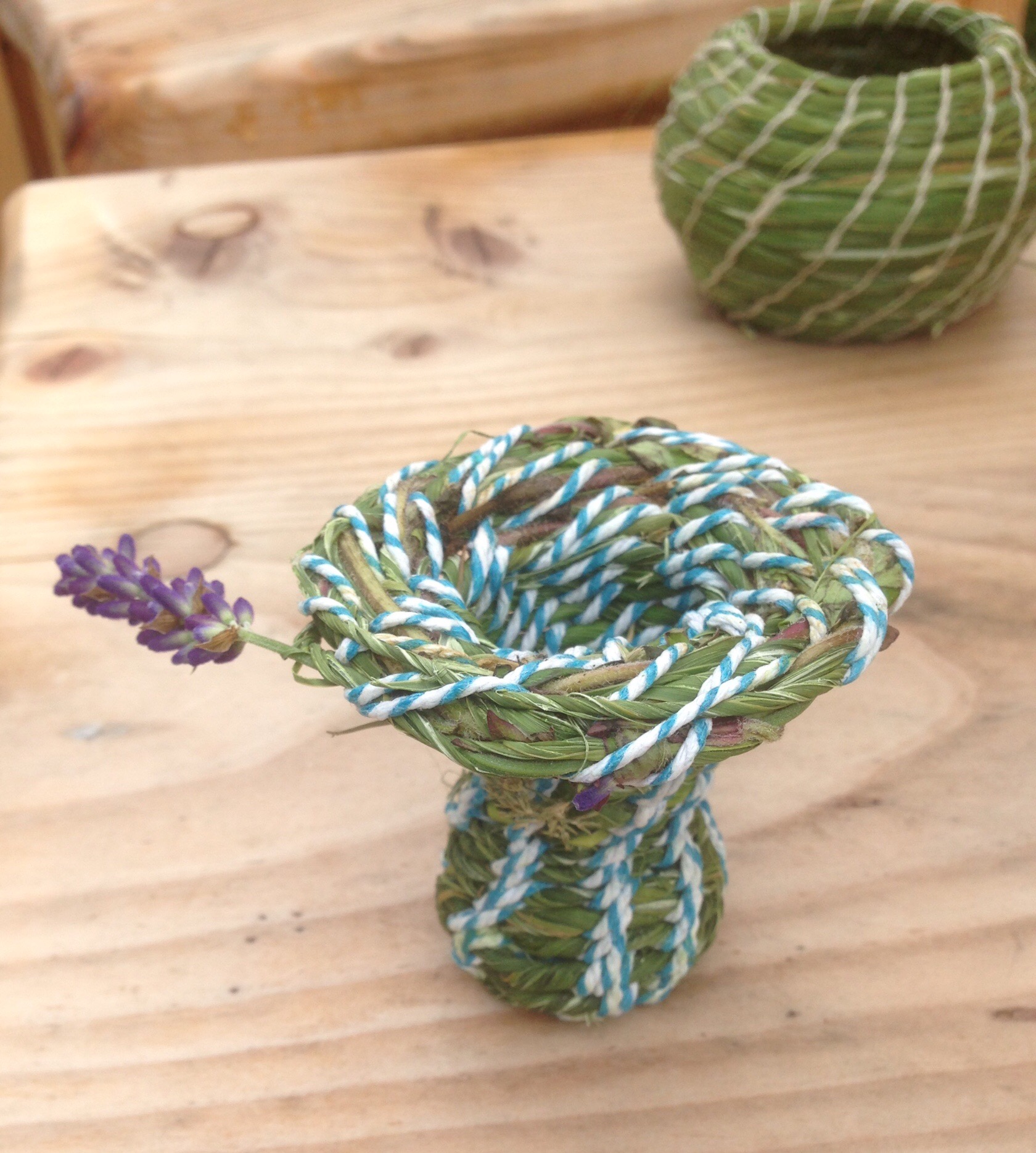 On Sunday six people came to my ‘Summer Baskets’ workshop at the Centre for Stewardship, my last workshop for the Living Lomonds Crafts of the Hills project. Over the last three years we have explored local heritage crafts in workshops and drop-ins, finding out a lot about local materials on the way. For ‘Summer Baskets’ I provided reedmace leaves, soft rushes and grasses, with some scented herbs for extra interest.