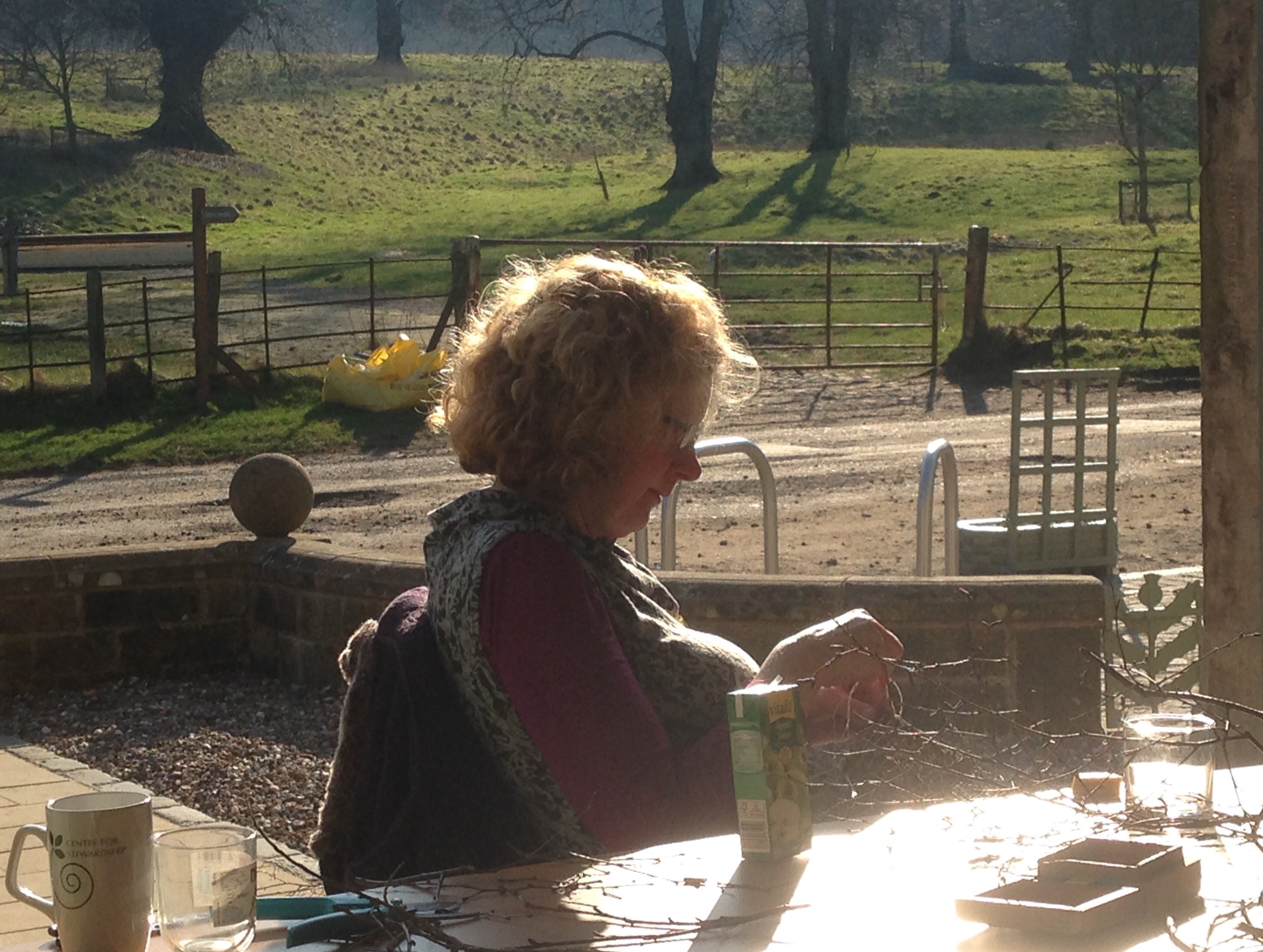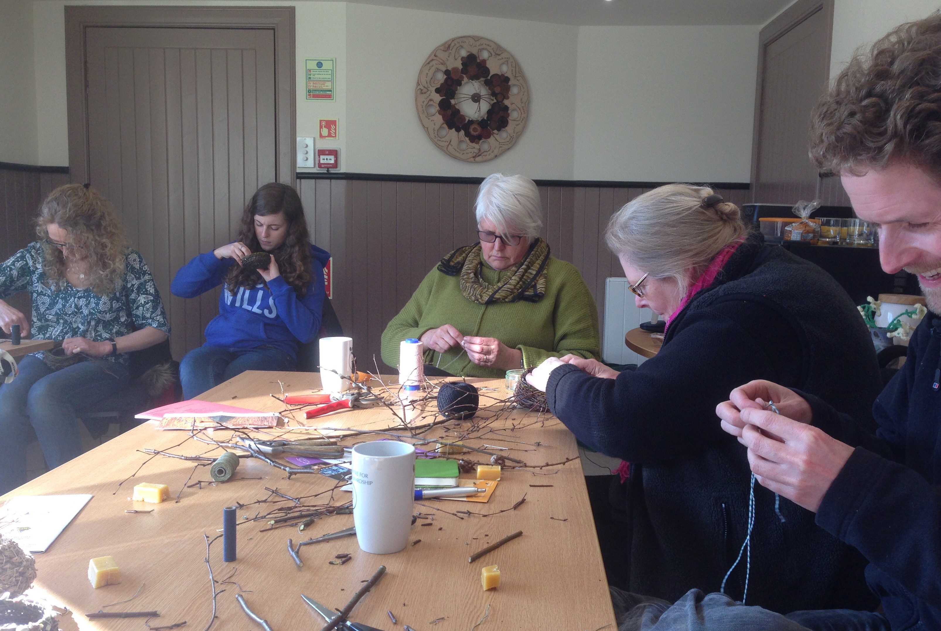 On Sunday, one person found that rolling the reedmace strands while stitching helped keep them together and the stitched coils also looked good. Others in the group tried it out and liked the result. Dialogue in action.