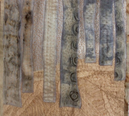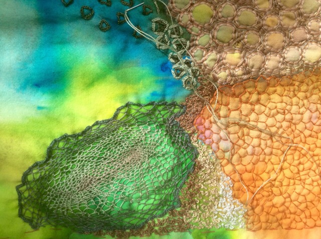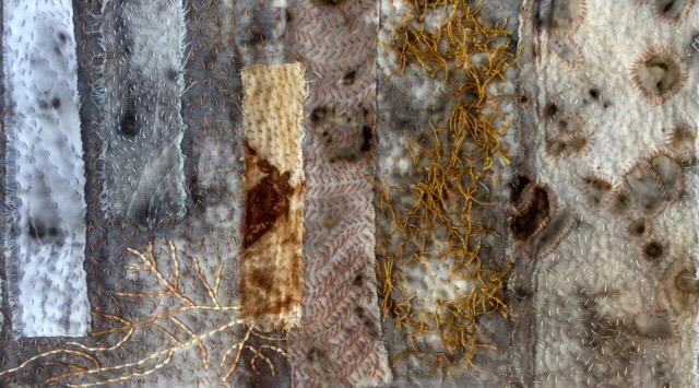Here are more photos of Tess’s lovely textile work inspired by Maspie Den, a place in Falkland Estate she visits often. It is a little valley carved into the north side of the Lomond Hills, sheltered and wooded with lots of damp-loving plants – a miniature tropical rainforest, but colder! Tess captures its atmosphere beautifully.