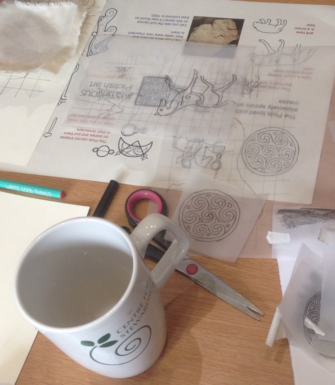 We used illustrations of Pictish stone carvings for reference and made notebooks for storing tracings and drawings