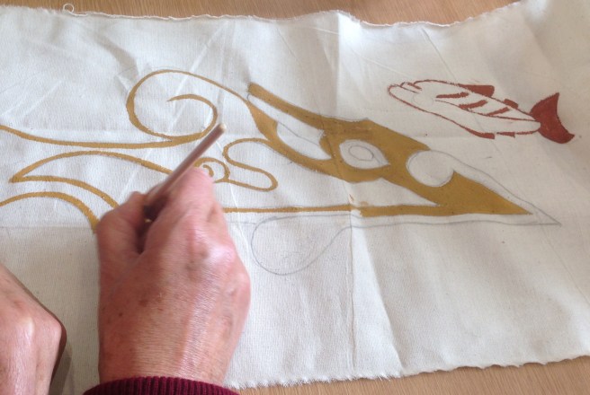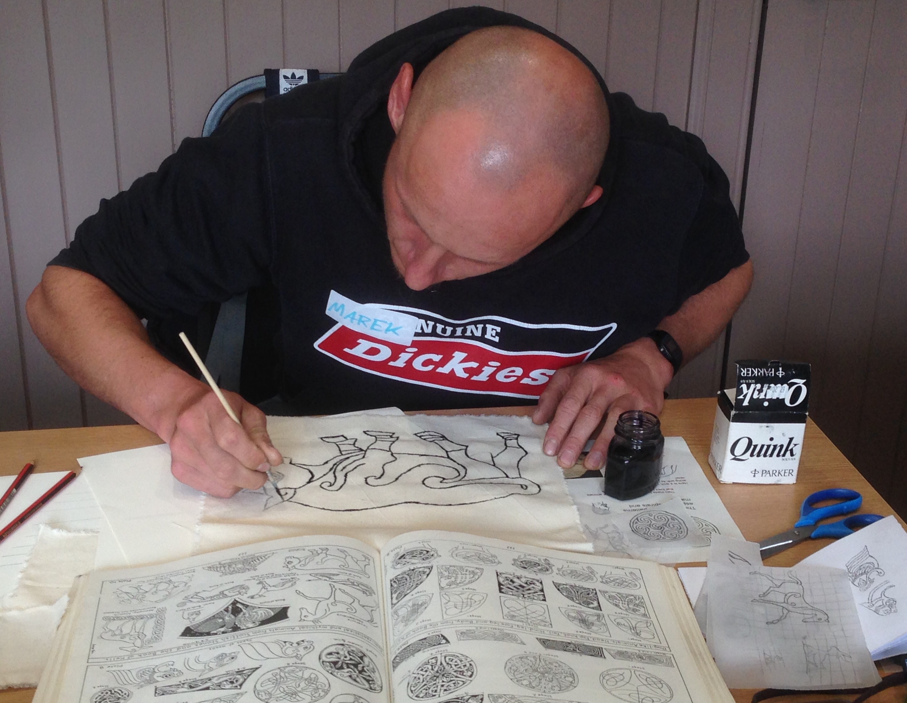 Here’s a visual record of the Pictish art workshop I ran at the Centre for Stewardship, Falkland on Saturday 30th May. I’m absolutely sure that Liz, Marek, Ali, Sophie and Sarah would be accepted as scribes and banner-makers by any self-respecting Pictish tribe…