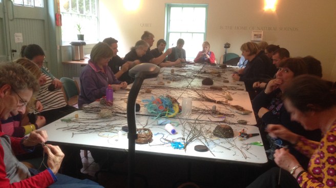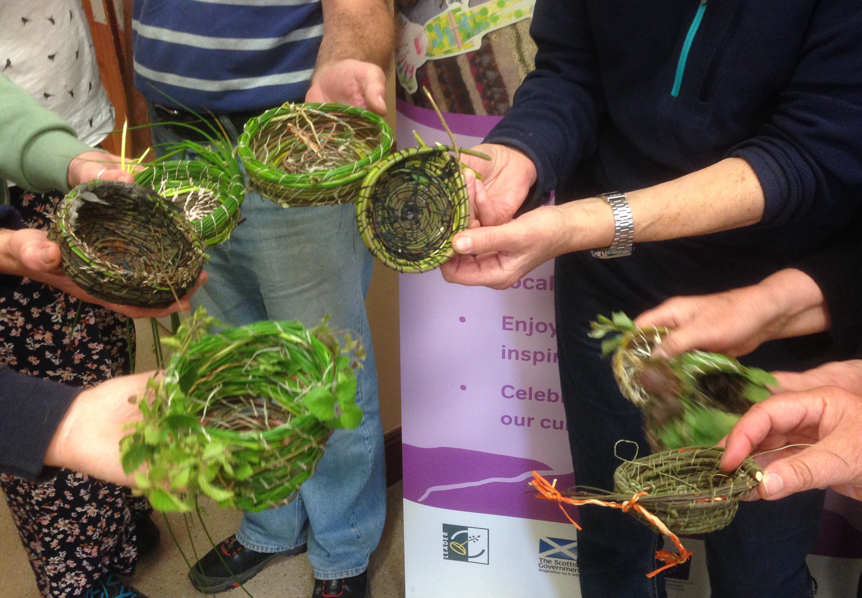 The SNH group had meetings and presentations in the morning and a choice of activities for the afternoon. The weather was dreich, the Big Dig on the Estate was rained off so I accepted a group of 20 for ‘Fast Baskets’, a two-hour introductory session of birch coiling and stitching. The atmosphere was relaxed, the concentration was intense, the results were very impressive…