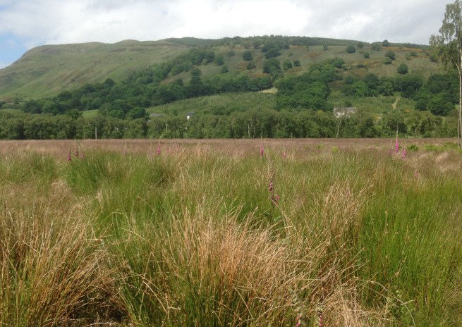 With permission (of course), I visited the Moss to collect materials to supplement my store of birch twiggage weeded out of the Lochore Meadows Country Park coppice woodland. Portmoak Moss is another undiscovered treasure close to home, I’m very glad this workshop gave me the incentive to explore it. It’s a surreal place. To get onto the Moss you have to climb a well-built flight of steps, taking you up a vertical face of dark dripping peat. At the top you look out over a landscape of grasses, rushes and mosses that could be Highland peat bog – with Bishop Hill in the background to remind you that you’re still in the Lowlands.