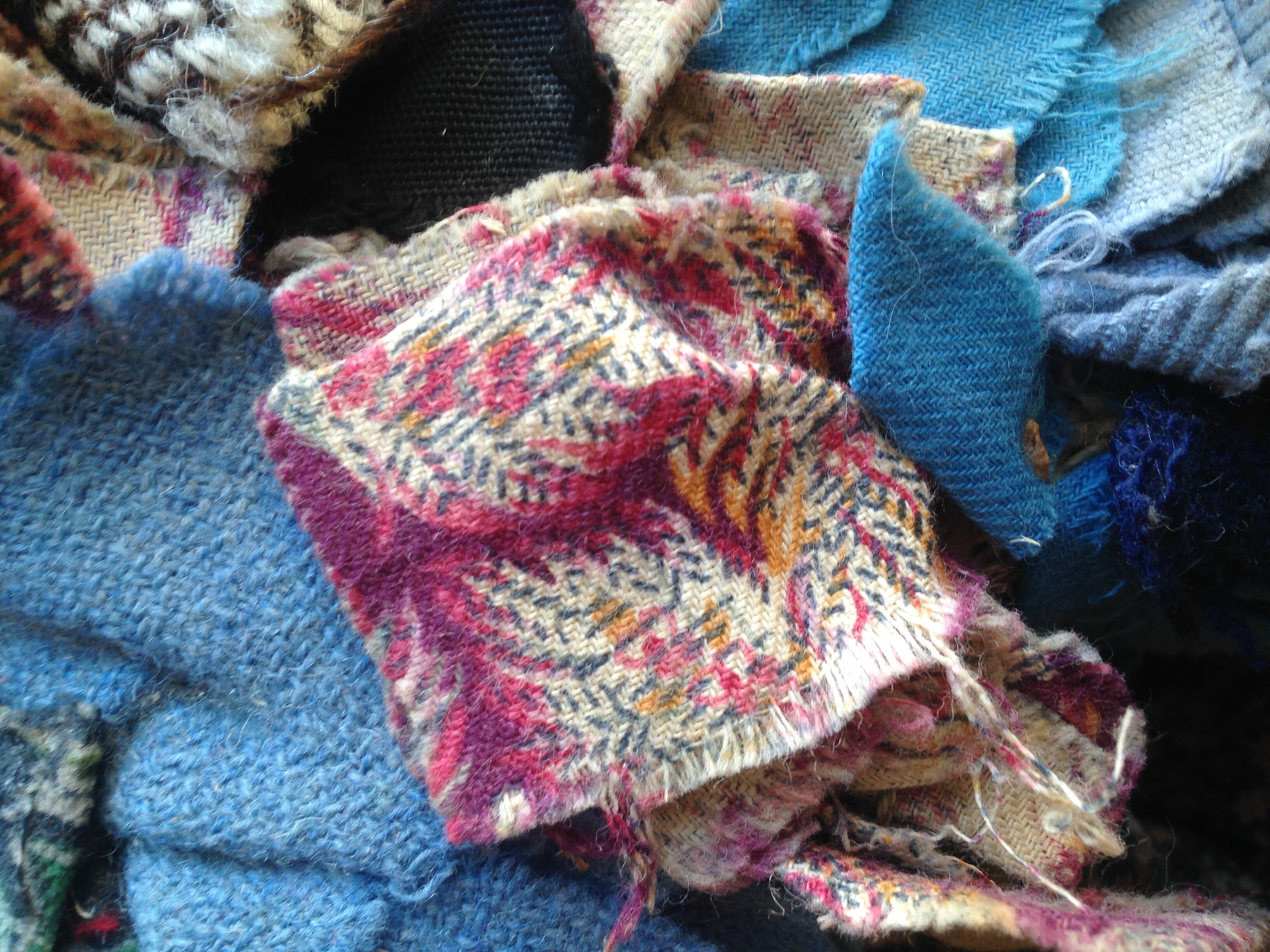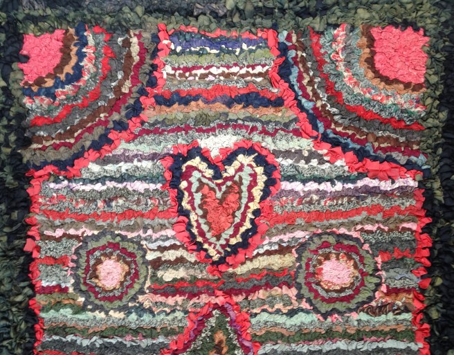 The fabric colours are still bright because they don’t often see the light. This one is my favourite. It is thick, backed with a red woollen material, possibly recycled red flannel petticoats. I love how the maker has used tiny squares of this red in the centre of the big ‘log cabin’ squares.