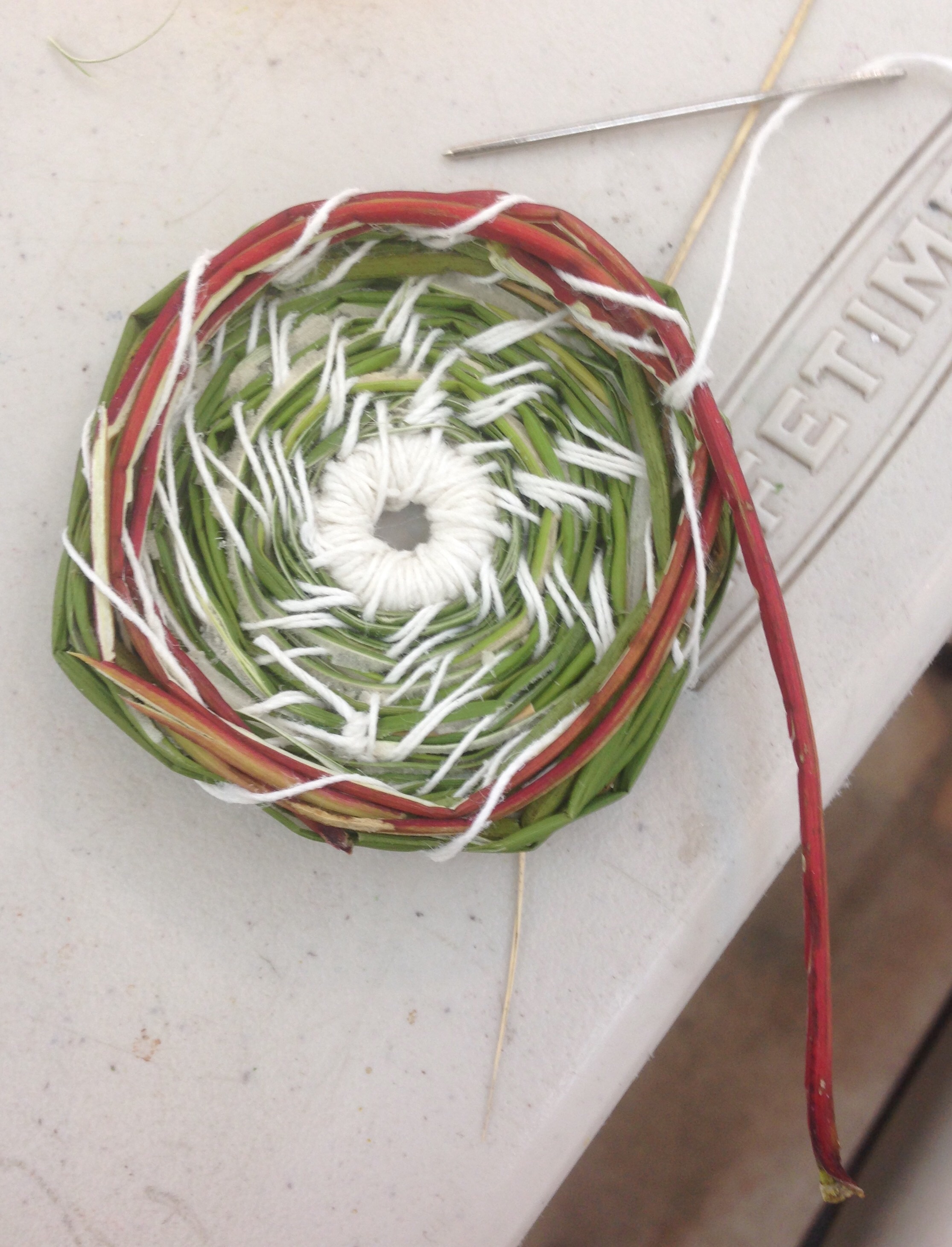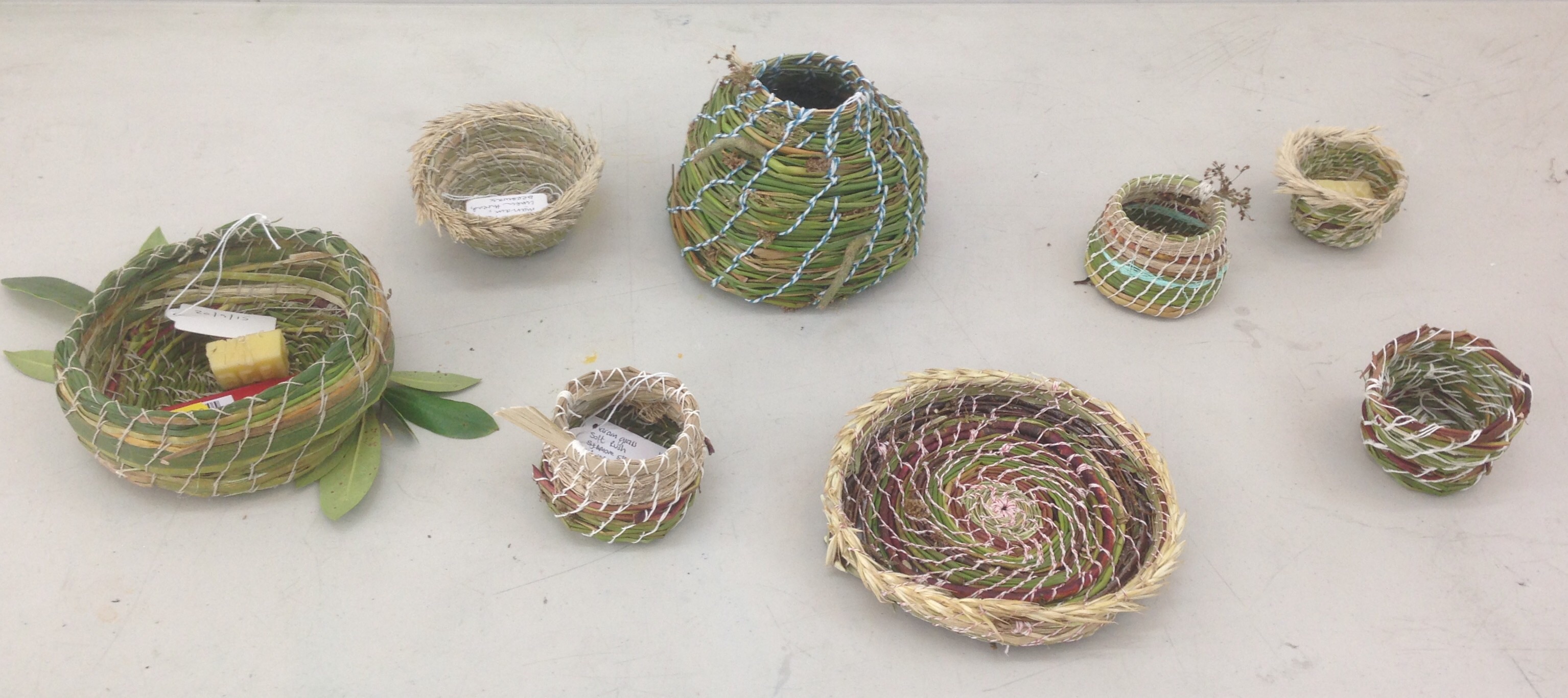 Reedmace leaves, marram grass, lyme grass, soft rush, jointed rush, birch twigs, sycamore leaf-stalks, rhododendron twigs and leaves, blackthorn twigs (thorns removed!), beach-combed ships’ ropes, linen thread, bakers’ twine, beeswax.